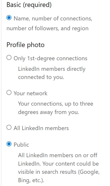 Make it hard to find a good photo of you. If you need a professional headshot on LinkedIn, limit it to connections by clicking your profile picture, going to Settings & Privacy > Visibility > Edit Your Public Profile. On the left side of your screen, you’ll see the options pictured below. Limit your profile photo to only 1st-degree connections, or at the very least to LinkedIn members so it won’t show up in a regular Google search.